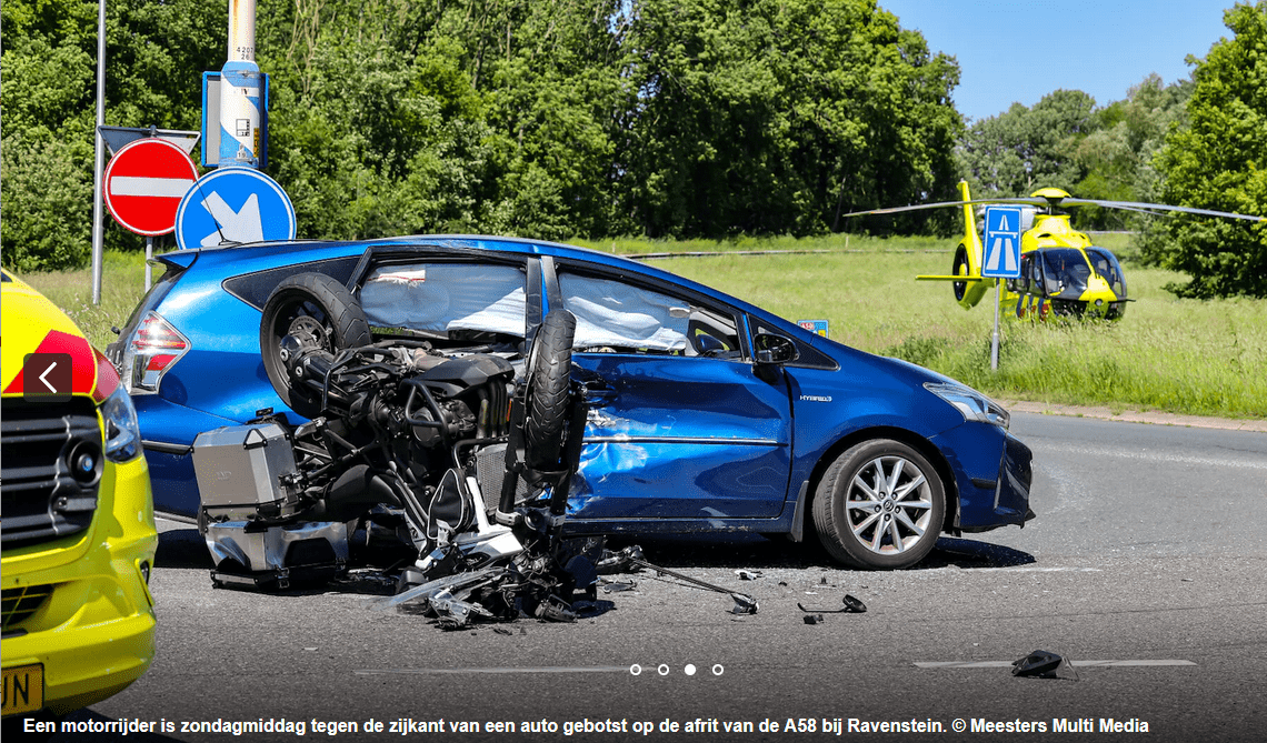 Not my picture, as stated in the original. © Meesters Multi Media. Taken from "de Gelderlander" news site. But... This is what happened on my birthday. The blue car, my parents were in that, with their dog. The motor hit their car, as my dad tried to turn to the highway ramp. Dad was in the wrong, but we/I don't know yet how this could have gotten wrong so badly... I will try to keep sharing things here as I usually do, but I may be less responsive, as I'm still struggling with all sorts of emotions. I wrote a Toot about it here: https://beige.party/@PixysJourney/114491384320373318 So yeah... I really hope that the motor driver will be able to recover fully... I don't think dad could live on, battling his demons, while also knowing that he may have caused everlasting harm... Ugh... #Accident #WorstBirthdayEver #NotMyPicture